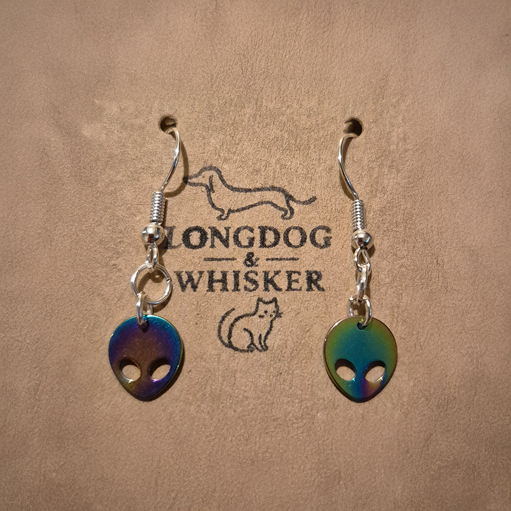 Dangle earrings with small alien head charms in an iridescent, rainbow finish. The simple teardrop-shaped faces with large cut-out eyes give a fun, sci-fi feel that catches the light as they move.