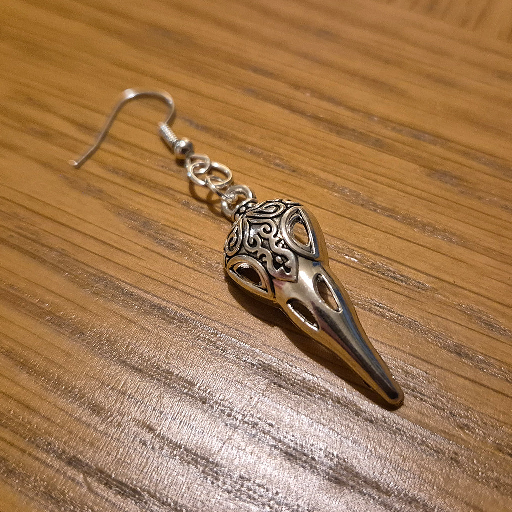 Dangle earrings with an ornate silver-tone bird skull charm, decorated with swirling carved details around the eyes and crown. The long, pointed beak and filigree-style pattern give these a dramatic, gothic feel.