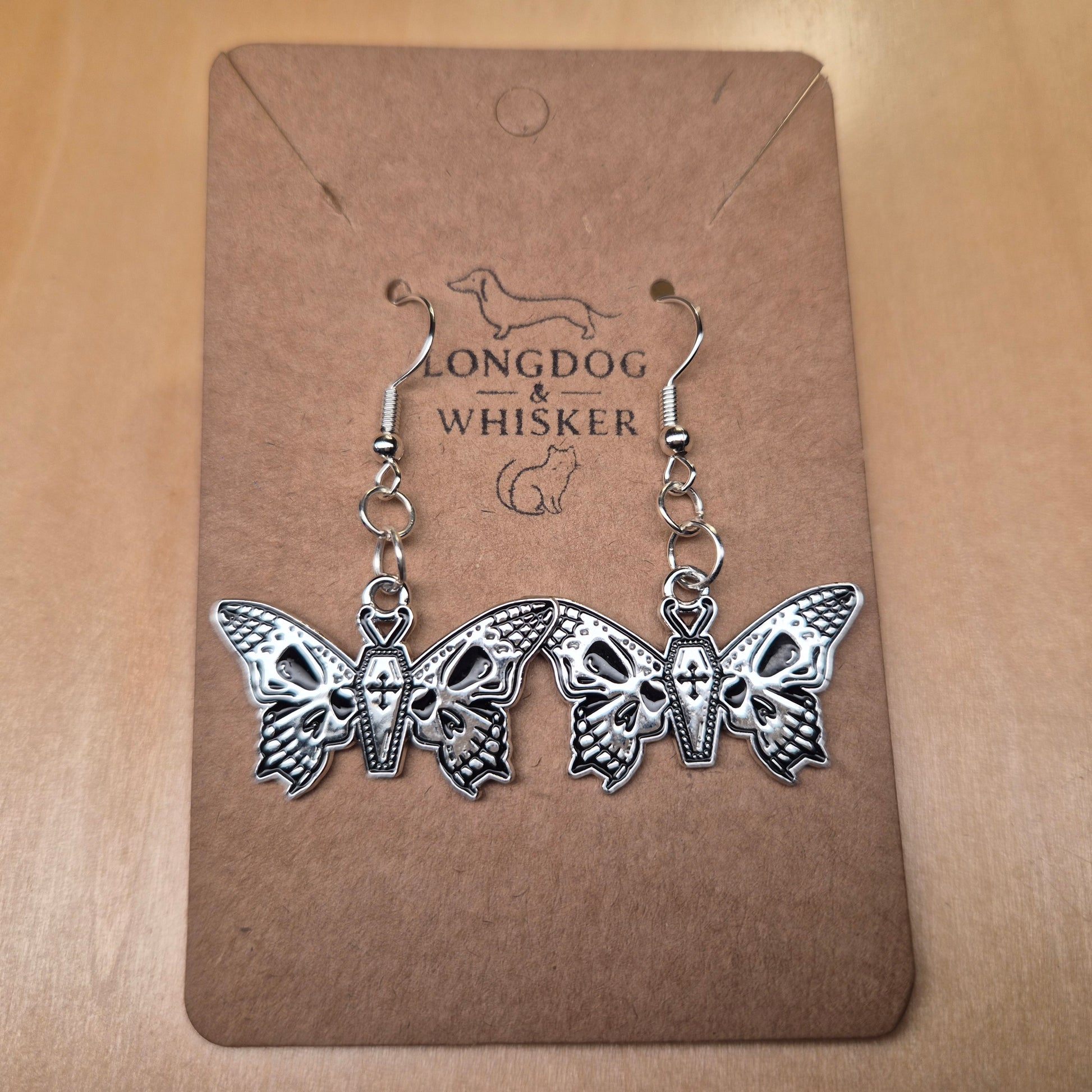 Dark, detailed and a little bit dramatic, these Coffin Butterfly Earrings are made for gothic jewellery lovers. Each silver-tone butterfly features tiny skull details in the wings and a coffin at the centre, picked out with black enamel-style accents for extra contrast.