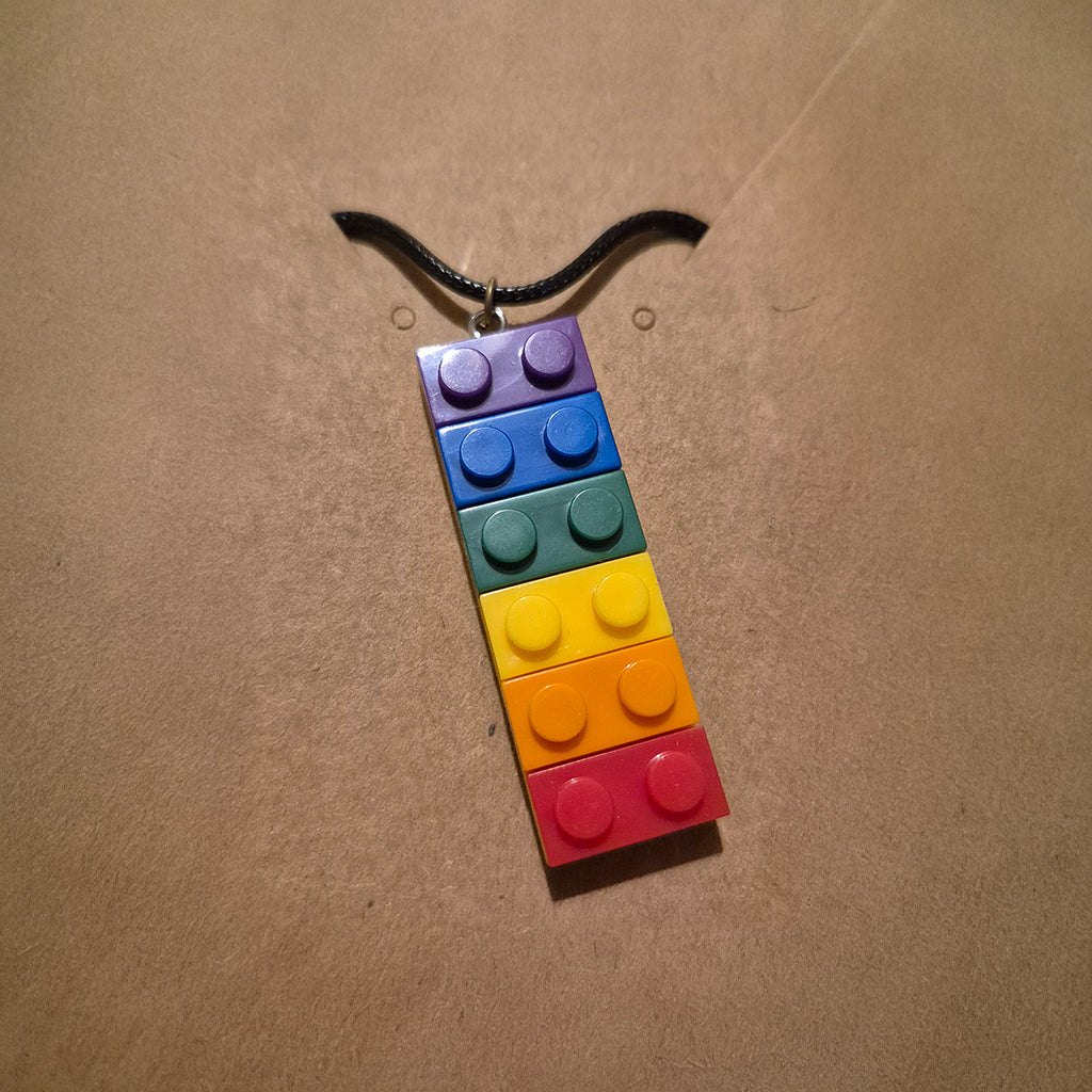 Necklace featuring a rectangular rainbow “brick” pendant in stacked purple, blue, green, yellow, orange and red blocks, hanging from a simple black cord. The bright, chunky design gives a fun, toy-like look while showing off the full pride colour spectrum.