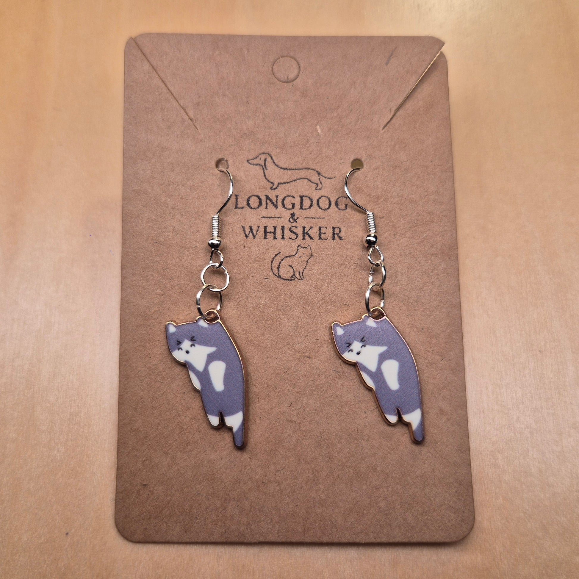 These Scruffles grey cat earrings are purrfect for anyone who loves a slightly scruffy, laid-back kitty. Each charm features a relaxed grey and white cat with a simple, doodle-style face, dangling from lightweight silver-tone hooks that are comfy enough for all-day wear.