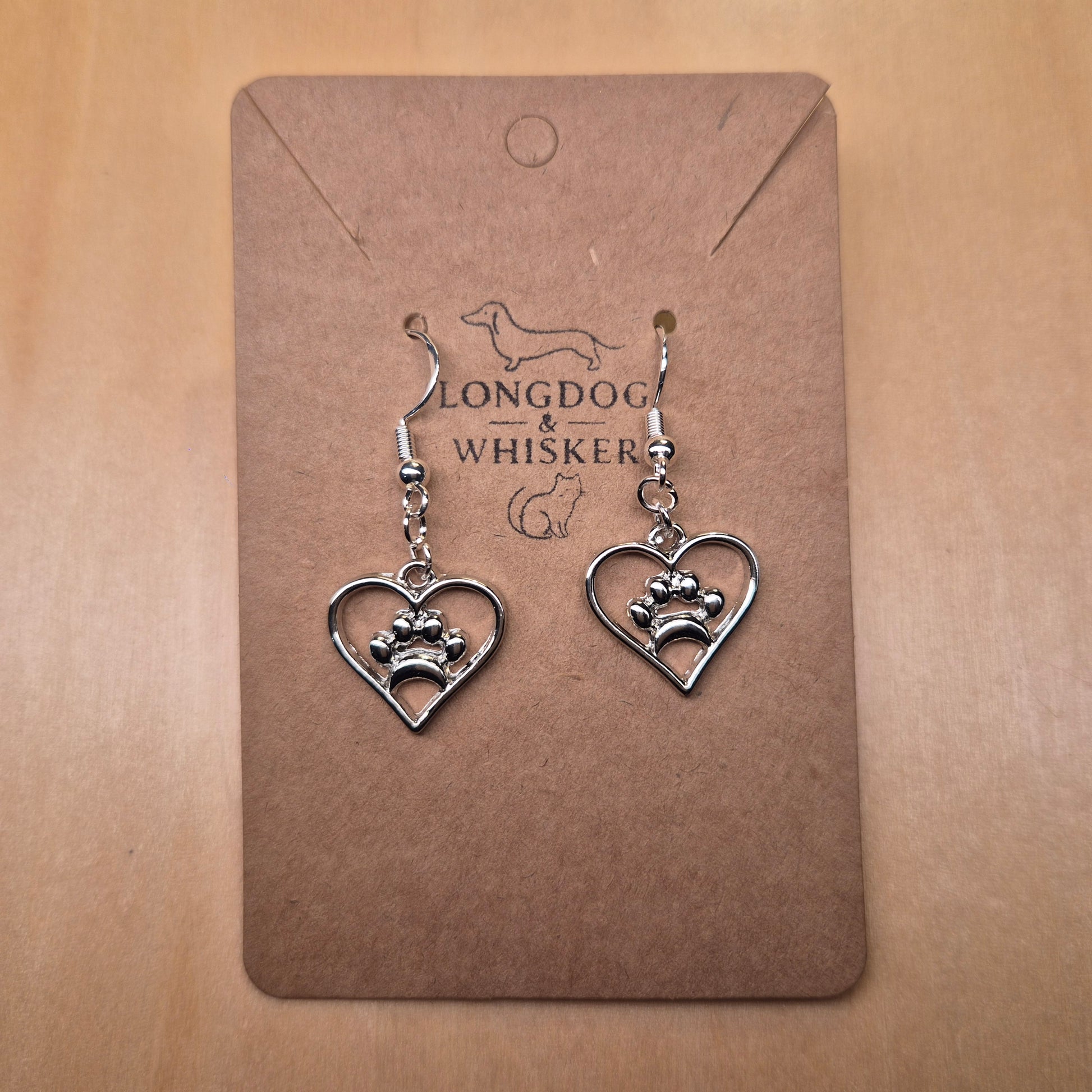 Celebrate your love for dogs with these silver heart dog paw print earrings. Each lightweight drop features an open heart with a raised dog paw in the centre, giving a simple, elegant nod to the pups who have your whole heart.